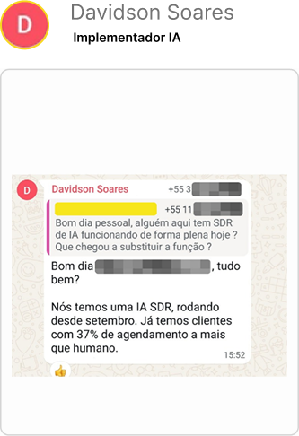 “IA SDR rodando desde setembro. Clientes com 37% de agendamento a mais que humano"